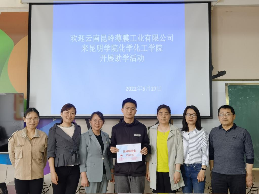 5月27日下午,在昆明学院化学化工学院惟真楼3409,云南昆岭薄膜工业有限公司刘莉经理带队专程来开展助学活动,化学化工学院王宝玲院长、刘星副书记、鞠海东副院长与到访昆岭薄膜公司成员交谈并表示衷心感谢。
