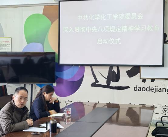 3月28日,化学化工学院党委举行深入贯彻中央八项规定精神学习教育启动仪式,传达学习习近平总书记关于深入贯彻中央八项规定精神学习教育的重要讲话和重要指示精神,传达学习党中央、省委和学校党委有关会议和文件精神,按照学校党委工作要求,第一时间研究制定学院工作方案,召开会议,对学习教育作出部署。